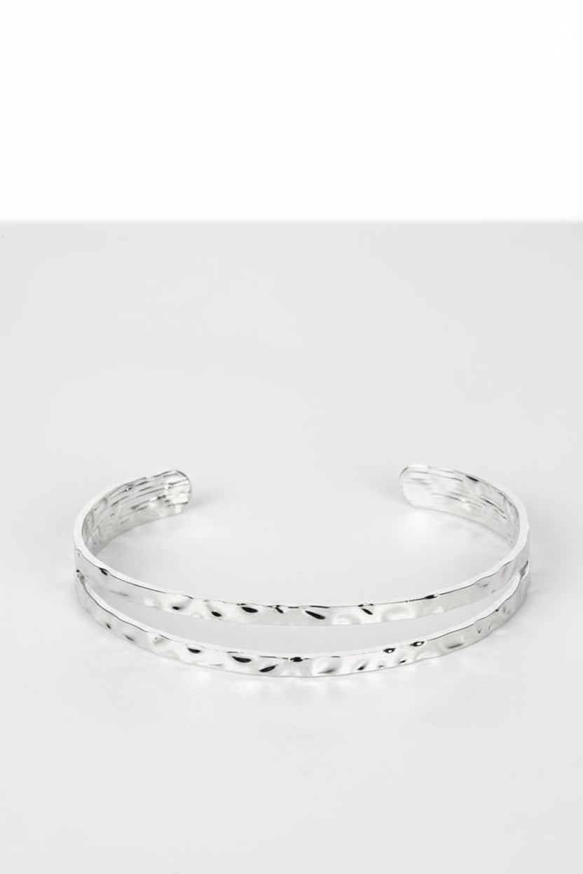 The center of a hammered silver cuff splits into layers across the wrist, resulting in an edgy metallic palette.