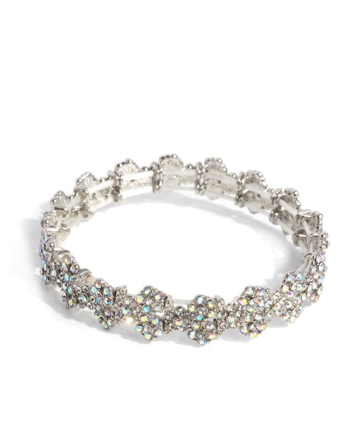 Infused along elastic stretchy bands, stacked silver flowers made up of iridescent rhinestone petals around white centers alternate with solitaire white rhinestone flowers with iridescent centers along the wrist for a whimsical pop of color. Due to its prismatic palette, color may vary.