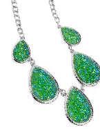 Glittering green teardrop-shaped frames, filled with shimmering multi-dimensional druzy-like stones, link together across the neckline, creating a bold and dazzling statement. incased in textured silver settings, the vibrant green hues catch the light for a mesmerizing finish.
