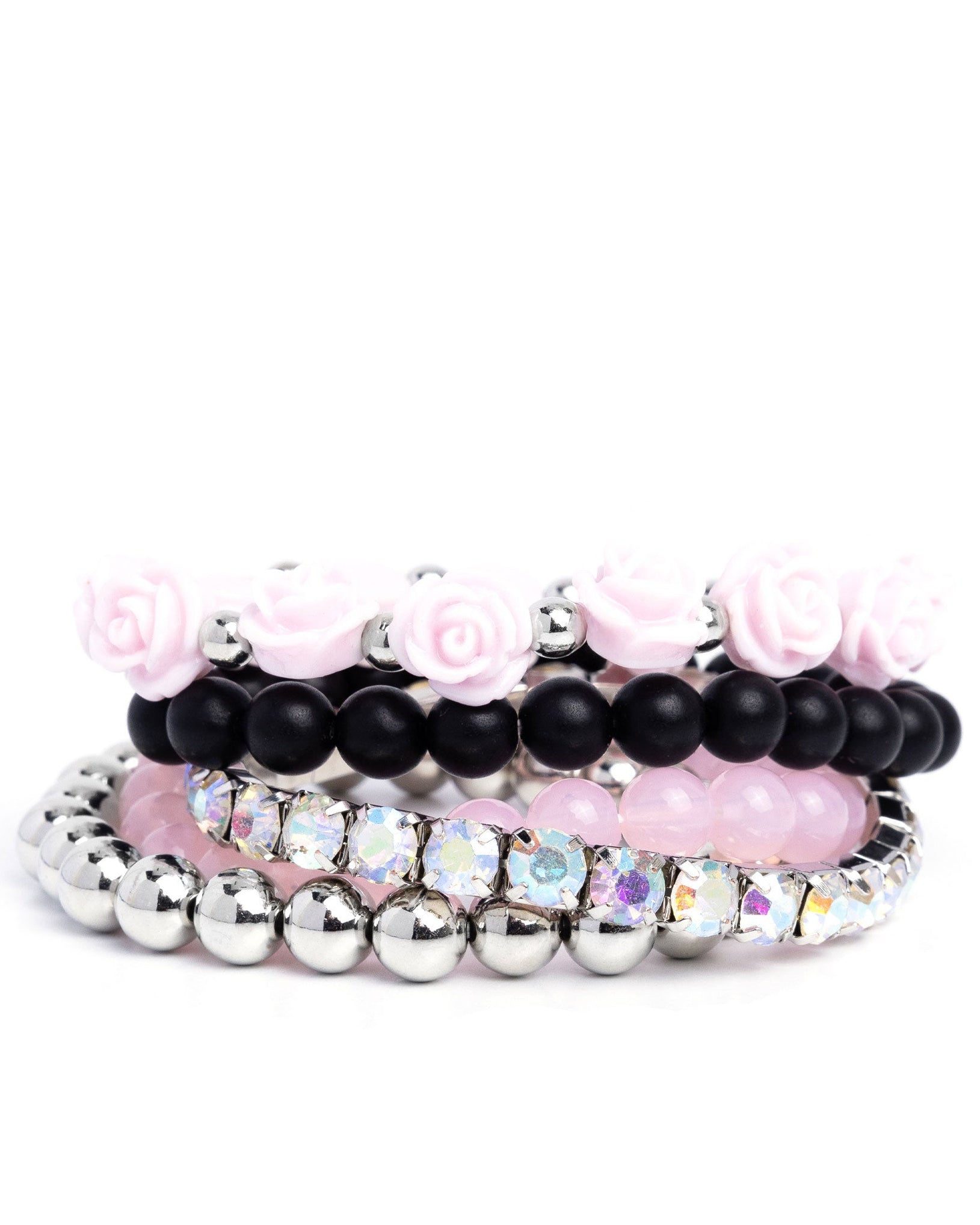 A vintage inspired collection of light pink resin roses, black matte and milky baby pink beads, and classic silver beads join a stretchy band of glittery iridescent rhinestones dotted around the wrist for a flawlessly stacked look.